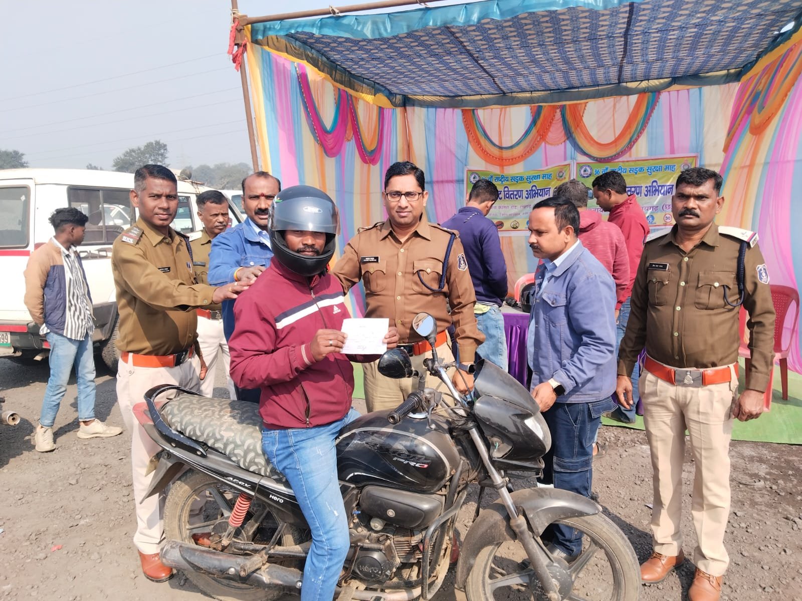रायगढ़ । राष्ट्रीय सड़क सुरक्षा माह 2025 के अंतर्गत रायगढ़ पुलिस द्वारा सड़क सुरक्षा और हेलमेट की अनिवार्यता के प्रति जागरूकता बढ़ाने के उद्देश्य से लगातार प्रभावी कदम उठाए जा रहे हैं। पुलिस अधीक्षक श्री दिव्यांग कुमार पटेल के निर्देशन में यातायात पुलिस ने रायगढ़-खरसिया मुख्य मार्ग पर ग्राम जोरापाली के पास मोटर व्हीकल एक्ट के तहत चालानी कार्रवाई करते हुए बिना हेलमेट चलने वाले वाहन चालकों को नि:शुल्क हेलमेट प्रदान किए।