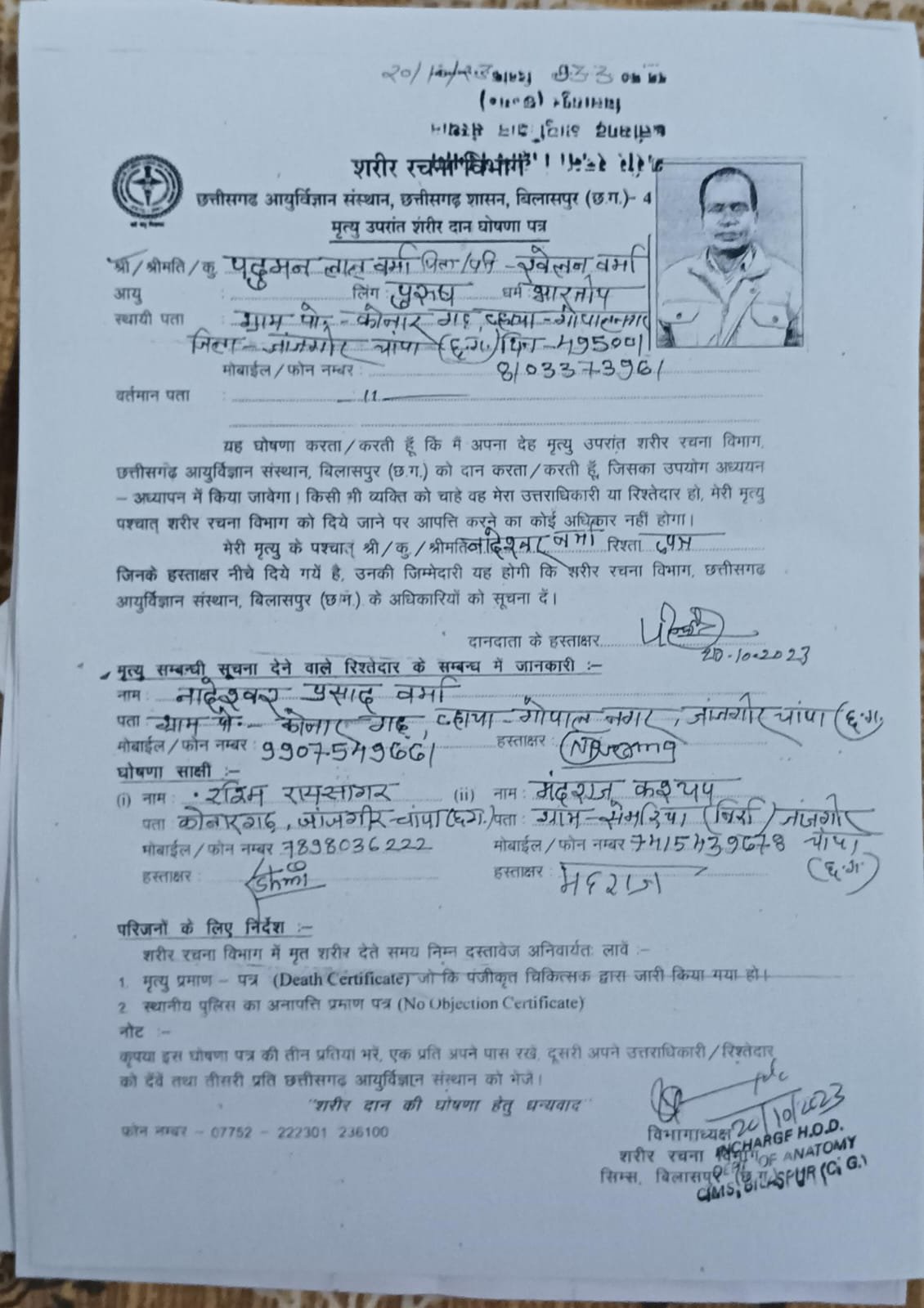 जांजगीर/ अकलतरा। मानवता की भलाई के लिए देहदानी की अनुकरणीय मिसाल करने वालों में ग्राम कोनारगढ़ पामगढ़ निवासी देहदानी पदुमन लाल वर्मा का नाम भी शामिल हो गया। उन्होंने 43वर्ष तक शिक्षा विभाग में अर्थशास्त्र व्याख्याता के पद में सेवा देते हुए स्वामी आत्मानंद उत्कृष्ट हिन्दी माध्यम शासकीय उच्चतर माध्यमिक विद्यालय डोंगाकोहरौद से 30 सितंबर 2023 में रिटायर हुऐ है। जिन्होंने अपना मृत्यु उपरांत अपने शरीर को शरीर रचना विभाग छत्तीसगढ़ आयुर्वेद विज्ञान संस्थान सिम्स बिलासपुर को देहदान का संकल्प पत्र देकर एक अनूठी मानवता की एक नई सेवा की मिसाल पेश की यह संकल्प पत्र अपने बड़े पुत्र नादेश्वर प्रसाद वर्मा एवं दो गवाहो के समक्ष रचना विभाग छत्तीसगढ़ आयुर्वैदिक संस्थान सिम्स बिलासपुर को प्रस्तुत किया जिसमें मृत्यु के बाद घर वालों वह रिश्तेदारों को किसी भी प्रकार आपत्ति करने का कोई अधिकार नहीं होगा एवं उनकी जिम्मेदारी होगी कि शरीर रचना विभाग आयुर्वेदिक संस्थान सिम्स बिलासपुर को सूचना दें। उन्होंने बताया कि उसका लड़का मेडिकल कॉलेज में डॉक्टर की पढ़ाई कर रहा था। तो मानव शरीर नहीं मिलने के कारण पढ़ाई में क्या-क्या समस्या आती है। और मानव शरीर की कितनी आवश्यकता है। उन सब को जानने के बाद उन्होंने उसी समय से ठान लिया था।