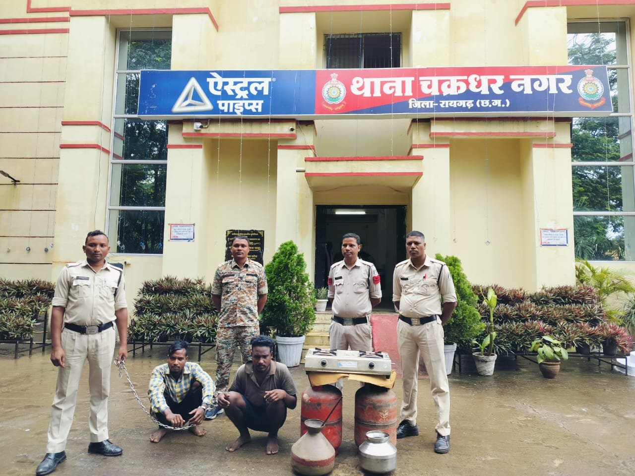 कल प्रार्थी रोहित कुमार यादव ने थाने आकर रिपोर्ट दर्ज कराया कि टी0वी0 टावर के सामने आर्यन फर्नीचर का गोदाम है, दिनांक 12.08.2024 को रात्रि गोदाम को बंद कर अपने घर चला गया सुबह गोदाम में आया तो देखा कि दरवाजा का ताला टूटा हुआ था, गोदाम में पूर्व से रखे दो नग HP कंपनी का खाली गैस सिलेंडर , कांस का गघरा 01 नग, स्टील गघरा 01 नग, गैस चुल्हा 01 नग कुल कीमती करीबन 10,000/ रूपये नहीं था, कोई अज्ञात व्यक्ति द्वारा रात में गोदाम का दरवाजा का ताला तोडकर गोदाम से चोरी कर ले गया है । मामले की रिपोर्ट पर अज्ञात आरोपियों के विरूद्ध अपराध दर्ज कर टीआई प्रशांत राव द्वारा मुखबीरों को सक्रिय किया गया और सूचना पर संदेही की तलाश में अंबेडकर नगर, पहाड़ मंदिर में दबिश देकर दो संदिग्ध शिव सारथी और कुश केरकेट्टा को हिरासत में लिया गया । सख्ती से पूछताछ में संदेहियों ने टीवी टावर के पास स्थित आर्यन फर्नीचर गोदाम से चोरी करना स्वीकार किये। आरोपियों के मेमोरेंडम पर चोरी के सामान को सूर्या विहार कॉलोनी के पीछे खाली पड़े अटल आवास में छिपाकर रखना बताये । आरोपियों से चोरी के सारे सामान और घटना में दरवाजे का ताला तोड़ने में इस्तेमाल की गई लोहे की रॉड जप्त किया गया है। आरोपी (1) शिव सारथी पिता सालिक राम सारथी उम्र 20 वर्ष (2) कुश केरकेट्टा पिता दिलीप केरकेट्टा उम्र 25 वर्ष दोनों निवासी टी.वी. टावर, कृष्णा नगर, चकधरनगर जिला रायगढ़, छत्तीसगढ़ को गिरफ्तार कर रिमांड पर पेश कर जेल भेजा गया है ।
